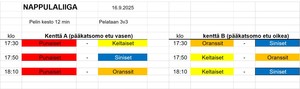 Joukkuejaot tehdään ilmoittautumisten perusteella ja niistä infotaan erikseen sähköpostitse. Mikäli et ole saanut ennen pelikierrosta tietoa, missä joukkueessa lapsesi pelaa, kysy asiasta Nappulaliigan kuuluttajalta. Peli-iltoina otteluita on kullakin joukkueella kolme. Yhden ottelun kesto on 14 minuuttia ja ne pelataan 3 vastaan 3.
